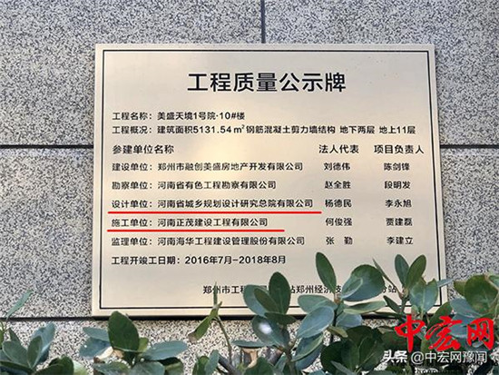 多棟樓房外墻懸掛的《工程質(zhì)量公示牌》顯示,設(shè)計(jì)單位為“河南省城鄉(xiāng)規(guī)劃設(shè)計(jì)研究總院有限公司”,施工單位為“河南正茂建設(shè)工程公司”。